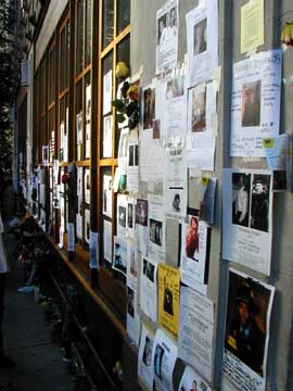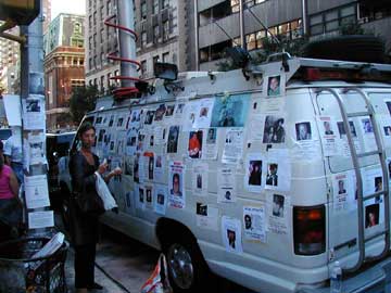 Saturday in Manhattan. Military Hummer by prayer station. The flyers of the missing are everywhere.